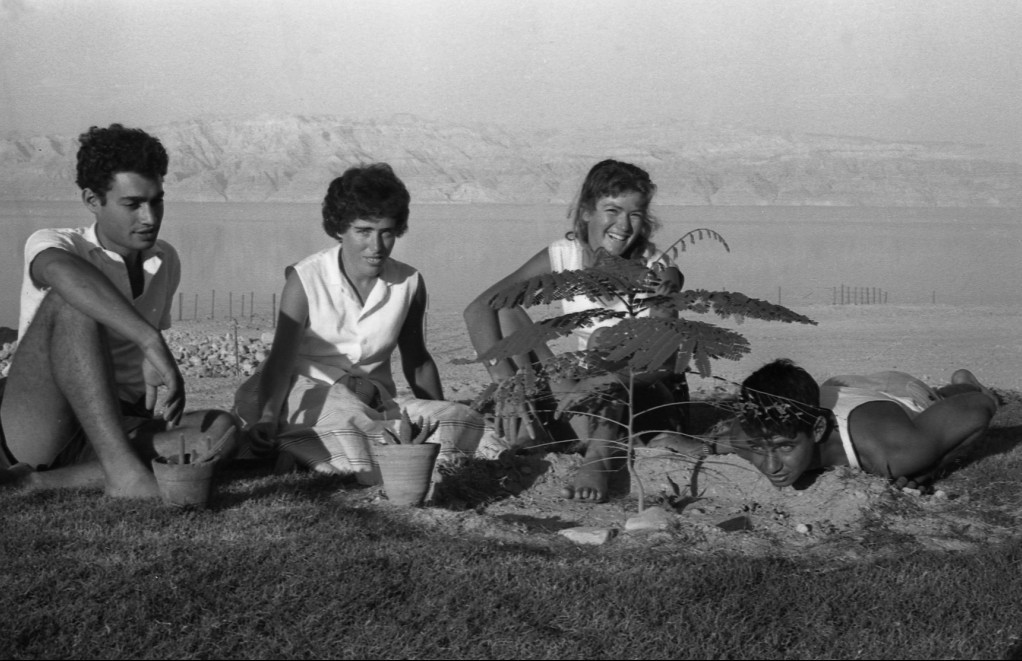 מצטלמים באהבה יחד עם עץ הצאלון הראשון שניטע בעין גדי.