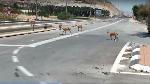 משפחת יעלים ועופריהם חוצים בבטחה ובביטחון את קטע כביש 90, שנחסם לתנועה עם התגלות בולענים בתוואי שלו.