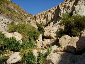 נחל דוד בתמונה מ-2003. נזקים מועטים בלבד נגרמו לנחל במרוצת השנים האחרונות. שאיבת המים לצרכי האדם פגעה רק בחלק המערבי של השמורה, שאורכו כמאה מטרים. שריפות של חישות הקנים במדרונות התלולים של הנחל נגרמו ע"י מטיילים, וקטע אפור של מדרון שלא שיקם עצמו נראה בשמאל התמונה. רוב רובו של אפיק הנחל נהנה מזרימה לא מופרעת של מים. מפולות סלעים של ימי שיטפונות גרמו לסגירת חלקים עליונים של השמורה לתקופה ארוכה למדי. חלקים עליונים עוד יותר סגורים באופן קבוע מפני מבקרים - לטובת בעלי החיים של השמורה. עיקרו של ויכוח הוא לגבי נקודת שאיבת המים, ואם יתברר שניתן להפיק את מרב הכמות מנקודה מזרחית יותר - הדבר כנראה יתבצע. |