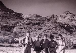 תמונת ארכיון מימי היאחזות הנח"ל בעין גדי (1953-1956) מאחורי קבוצת המטיילים נראה מדרון מעין עין-גדי - חשוף כולו מצמחיה. באותם ימים בהם עדיין לא שאבו מים ממעין זה, זרמו מי מעין עין-גדי בתוך האפיק העמוק של נחל עין-גדי הקטן והתלול, והזינו צמחיה מועטה לאורך פס צר של אפיק הנחל. בשנות ה-70 ומעט אחרי כן נעשו על ידי צוות השמורה ניסיונות להוריק את המדרון באופן מלאכותי ע"י פתיחת תעלות מהמעין אל המדרון. עם נטישת הפרויקט הזה - התייבשה הצמחיה שם, והמדרון חזר למה שהיה כמעט לאורך כל ההיסטוריה. |