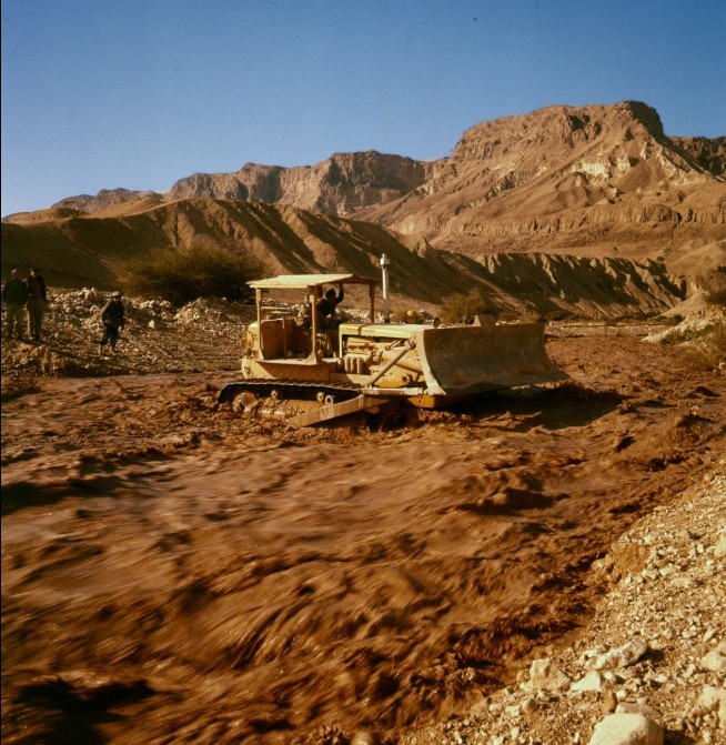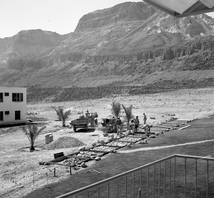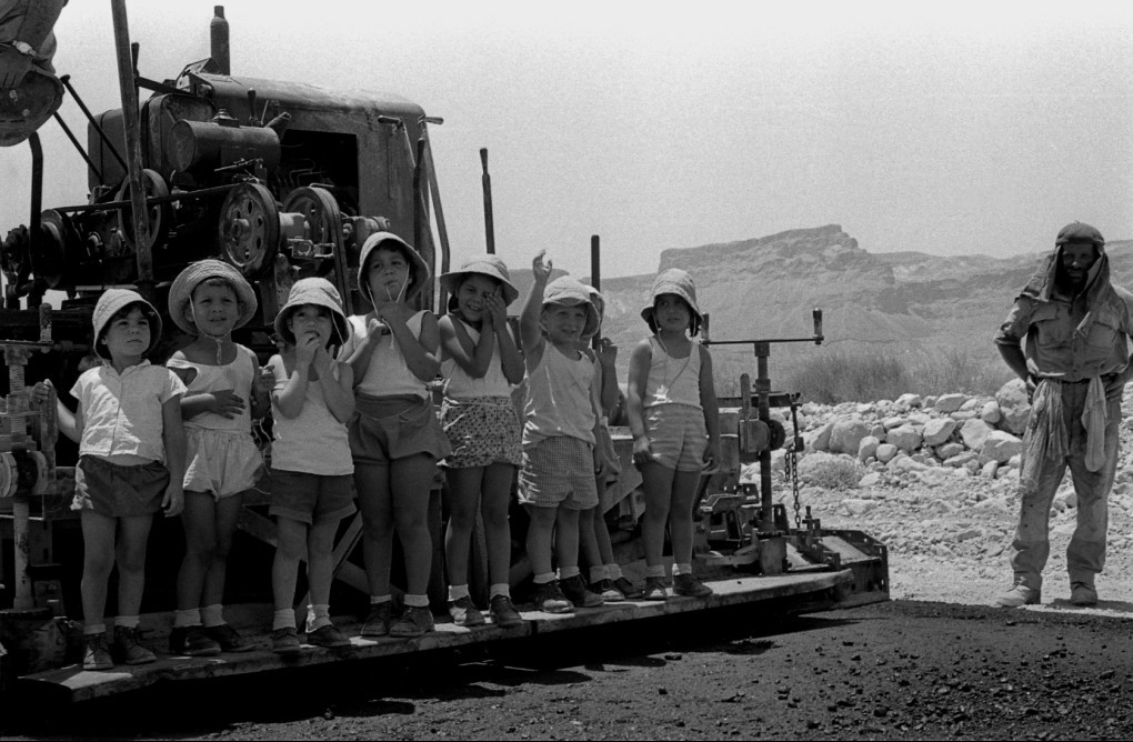 1961 הכביש מסדום לעין גדי בשלבים ש"הסוללת" ושובל האספלט "מתקרבים" לעין גדי, וכדי להנחיל המעמד לדורות הבאים הלכו ילדי עין גדי הראשונים להצטלם עם המתקן הסולל. ברקע, כנראה, מצדה.