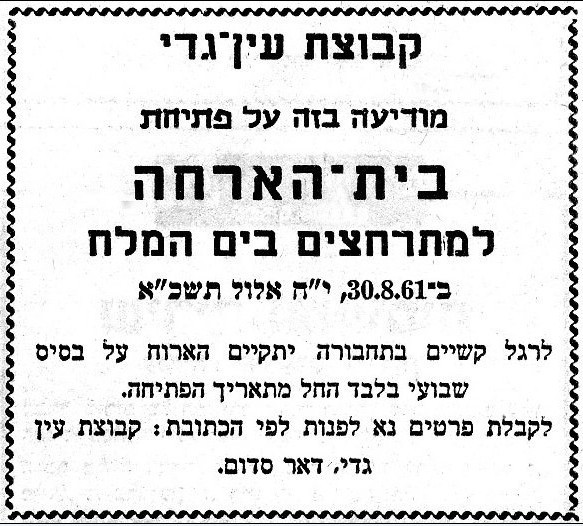 מודעה מהעיתון, יש בית הארחה. הוא כולל שני צריפים שהביאו מהקיבוץ ממקום משכנו הראשון. הפרטים בגוף המודעה.