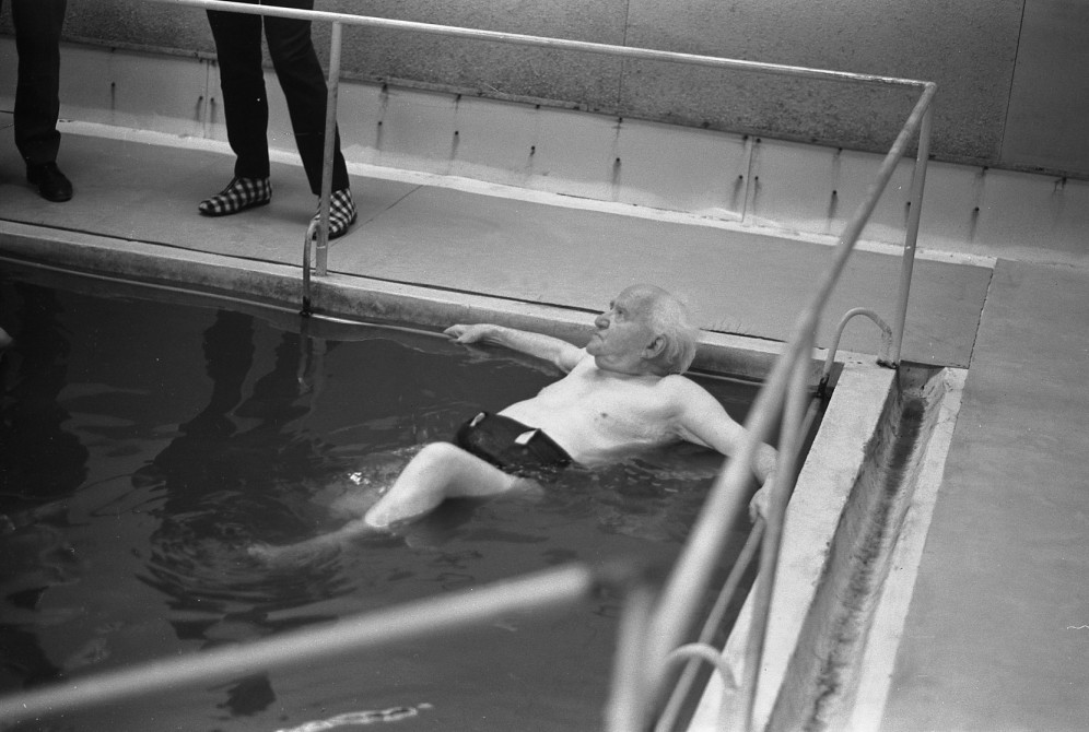 ראש הממשלה דאז דוד בן גוריון – מבקר בעין גדי ונהנה מציפה במים התרמו מינרלים של חמי עין גדי. שימו לב ל'נעלי-קִיפִּי ' שברקע, פריט אופנתי שכמעט ואבד עליו הכלח... מישהו יכול לתאר בדמיונו תמונה דומה של ראש ממשלה מימינו אלה ???
