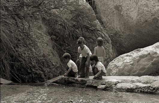 אל מימי הנחל ילדי עין גדי מטיילים בנחל ערוגות, מתעניינים ביצורי המים , הילד הרביעי דוקא צופה אל המצוקים הגבוהים