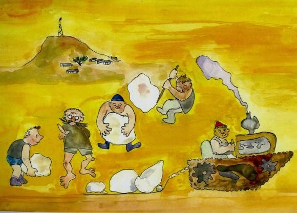 כולם (חוץ מצ'רלי - לפחות עפ"י ראות עיני הקריקקטוריסט זאביק רוזנבוים ז"ל), מסקלים מסלקים ומסקלים, העבודה שהיתה שגרת יומם של כל החברים והחברות בשנות ההתיישבות הראשונות ובנוסף אף גויסו לעבודה זאת חיילים ומחנות עבודה.